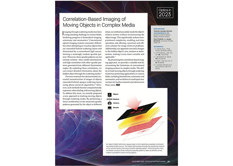 A summary of my research article “Tracking moving objects through scattering media via speckle correlations” was selected to be published in “Optics in 2023” via Optics & Photonics News (OPN) Magazine of Optica (formerly OSA).