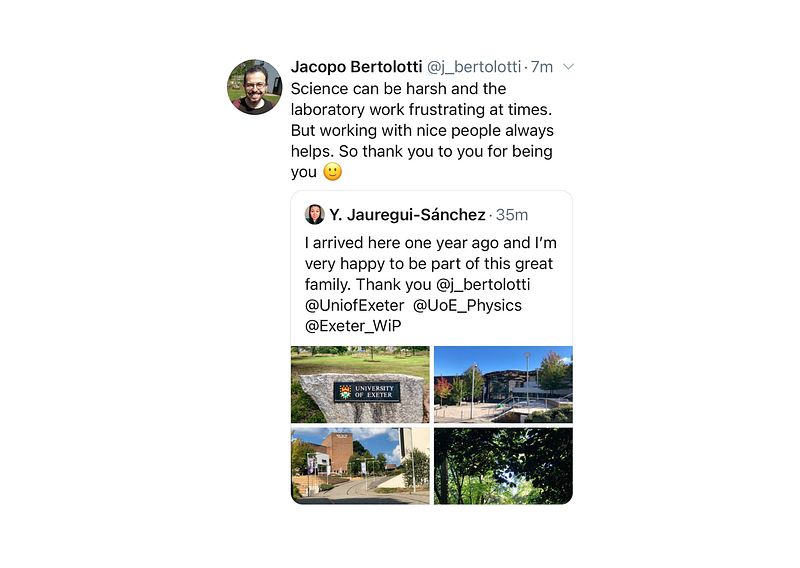 1st anniversary at the University of Exeter. My supervisor Prof. Jacopo Bertolotti reply to my tweet with very sweet and warm words.
