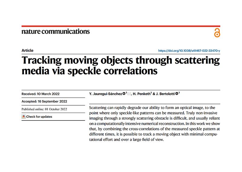 Our article titled "Tracking moving objects through scattering media via speckle correlations" was published in Nature Communications in October 2022.