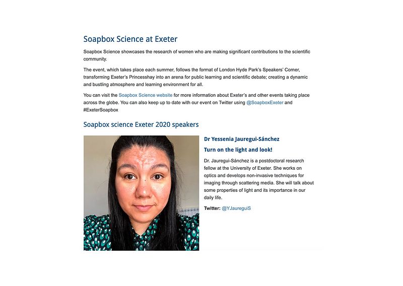 As a researcher, one of the activities I enjoy is outreach. For this reason, I would have liked to participate in Soapbox Science 2020 in Exeter. Unfortunately, this event was cancelled due to the lockdown.